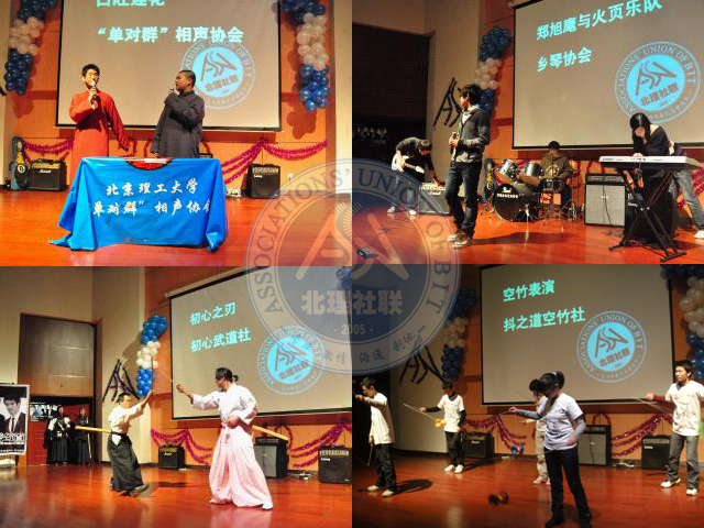 大学道晚会是BB贝博艾弗森官方网站的传统晚会,它是展示大学生丰富多彩的社团生活的一个大舞台,值此北理社联五周年之际,此次晚会也拉开了社联五周年系列活动的序幕。晚会首先由街舞社的成员献上两段劲爆的街舞表演,街舞社成员高超的表演艺术和激动人心的音乐让全场气氛顿时活跃起来。随后主持人介绍到场的嘉宾,晚会便正式开始。晚会上各社团都拿出了自己的拿手好戏,资本市场协会和京工演讲团分别朗诵了《金钱》和《壮士行》,荡气回肠的朗诵牵动着大家对人生的思考,单对群相声协会的相声表演正如他们所表演的相声名字一样--《口吐莲花》,抖之道空竹社的空竹表演则不禁让人惊呼,原来空竹也可以这样飞舞,奇炫魔术社则告诉我们,什么东西撕了都不用怕,找魔术社就能恢复原状。武协的双截棍在黑暗中舞出奇炫的色彩、剑道社专业的剑道表演更是让人感觉武道的美丽。还有乡琴协会的乐队演唱、酷爱轮滑社的轮滑表演、黑白漫画社的cosplay等等,使得晚会现场一次又一次地次达到高潮,演艺厅里掌声、笑声、惊呼声不断。