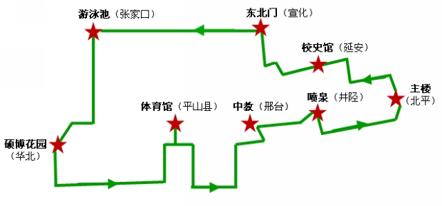 本次比赛途中设置主楼、校史馆、东北门、游泳池、硕博花园、体育馆、中心教学楼及中心花园喷泉共八站,分别对应着BB贝博不同时期校址。其中“宣化站”、“华北站”、“井陉站”设置了校史知识问答和趣味游戏,使同学们在环校义跑的同时休息放松,也增加了本次活动的知识性和趣味性。
