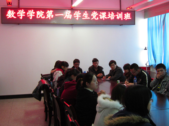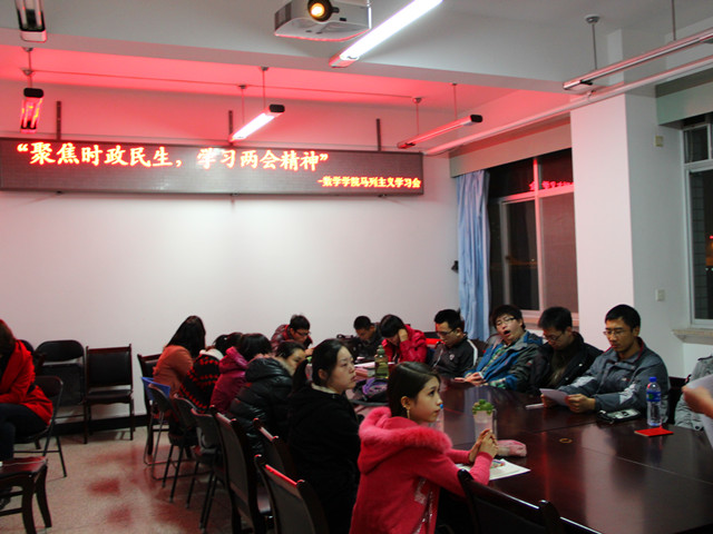 3月25日晚7:30,在中心教学楼620,数学学院开展了“聚焦时政民生,学习两会精神”主题交流活动。在入党积极分子中开展的两会精神学习交流活动,是本次党课的一个组成部分。18名入党积极分子共分为6个小组,分别针对感兴趣的议题搜集资料,作总结报告,共同讨论学习。讨论会上,6组同学分别就:教育问题、通货膨胀、校车安全、国防支出、开征遗产税、民间借贷等问题作了深入浅出的分析。除学习交流外,同学们还观看了由凤凰网制作的《中国人看两会》系列纪录片,进一步加深了对两会的了解和对两会精神的领会。