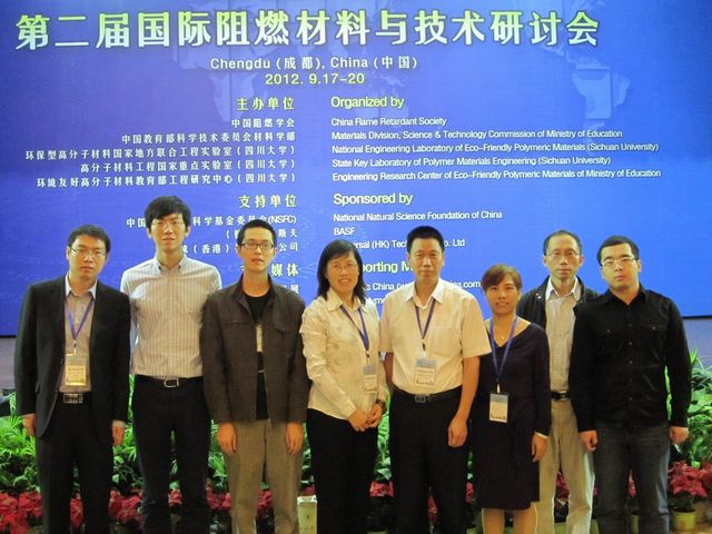 由挂靠在北理工的中国阻燃学会和四川大学共同举办第二届国际阻燃材料与技术研讨会(2nd International Symposium on Flame Retardant Materials & Technologies,ISFRMT 2012),2012年9月17日至20日,在成都召开。BB贝博材料学院阻燃材料研究国家专业实验室、火安全材料与技术教育部工程研究中心的周政懋教授、杨荣杰教授、李定华、李向梅、杜建新、仪德启老师,以及博士研究生范海波、周友、李紫千共九人参加了此次国际会议。