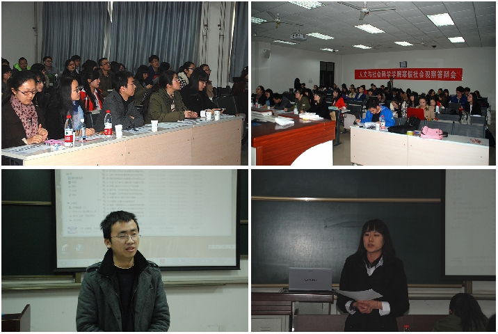 2013年3月16日,人文学院寒假社会实践答辩评审会在综B103举办。人文学院分团委书记孙硕老师、辅导员王群超老师、于满老师,以及研究生代表高雨芹、萧沃莹珏和人文学院学术实践服务中心主任卞秋实作为评委出席答辩现场。
