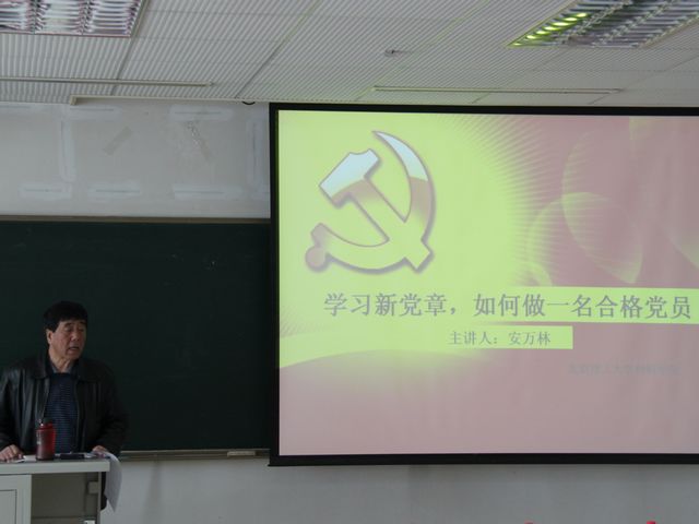 3月23日上午,材料学院特邀《高校后勤研究》杂志社副总编安万林进行题为“学习新党章,如何做一名合格党员”的学习辅导讲座。材料学院团委书记刘艳、部分学生党员和入党积极分子参加了讲座。安万林曾担任BB贝博党委宣传部副部长、党办副主任、直属总支书记、校工厂厂长及产业总支书记等,是一名有着丰富工作经验的老党员。他详细解读了新党章的六部分修改内容,对学生党员和入党积极分子提出了“真懂、真信、真做”的要求,指出作为一名合格党员要“认真学习党的理论知识,要加强党性修养、锻炼和实践,要加强道德建设”的三点要求。号召大家要坚持走中国道路,弘扬中国精神,凝聚中国力量。他深入浅出的讲解使大家对新党章有了全面的认识,深深的感受到作为一名共产党员的职责所在。讲座结束后,材料学院向安万林颁发了“学生党课特聘导师”的聘书,安万林表示今后会与材料学院学生党员和入党积极分子加强沟通,充分交流。