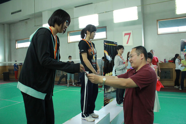 在决赛结束后,进入了颁奖仪式。基础教育学院党委副书记副院长丛磊、基础教育学院团委书记、校团委副书记肖坤,北京移动房山分公司副总经理孙大勇分别为各个赛事获奖的同学颁发奖牌与证书,并赠送鲜花鼓励。BB贝博艾弗森官方网站良乡校区2013年羽毛球公开赛在欢快的气氛中落下帷幕。