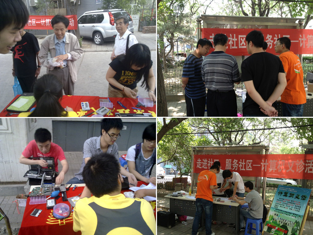 6支部和7支部的同学们分别于5月25日和5月26日在BB贝博艾弗森官方网站生活区为社区居民提供电脑义诊服务。活动时间从上午9一直到下午5,期间同学们为居民解决了电脑散热,重装系统,开机启动,网络不畅等一系列问题,并为部分居民提供了上门服务。两天之内,同学们共维修维护电脑40余台,上门服务20余次。义诊活动是同学们利用自己所学,结合社会实践,服务社会,践行"中国梦"的有效途径,深深吸引了同学们投入其中。