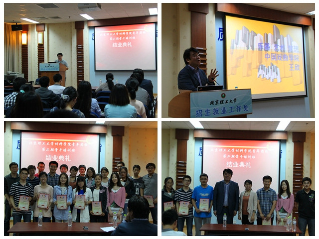 2013年6月7日晚,培训班结业典礼在唯实报告厅举行。材料学院副书记副院长张舰月为本期培训班的21名学员颁发了结业证书,并为表现优异的杨汇鑫等6名学员颁发了“优秀学员”证书。