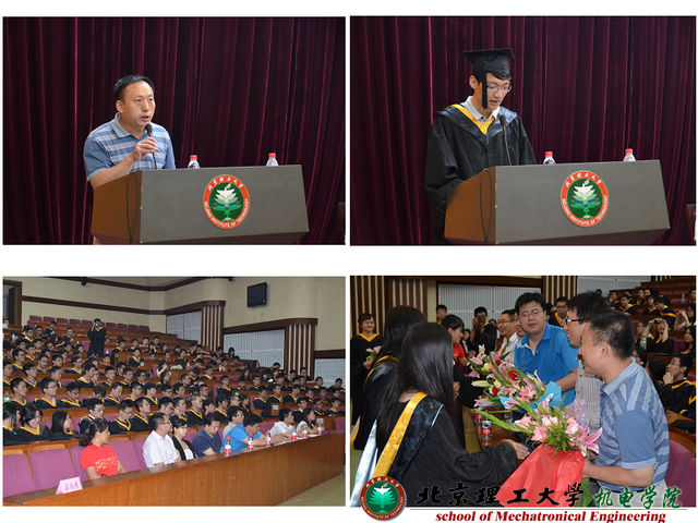 在全体师生奏唱国歌之后,首先由焦清介院长向全体毕业生致辞。焦院长首先表示了对全体机电学子光明前景的美好祝福,接着又对大家提出了新的期望与要求。要善于思考能做出正确判断,继承和发扬北理工实事求是独立思考的精神;同时要敢于作为勇于行动,同不良风气斗争,促进整个社会的共同进步。