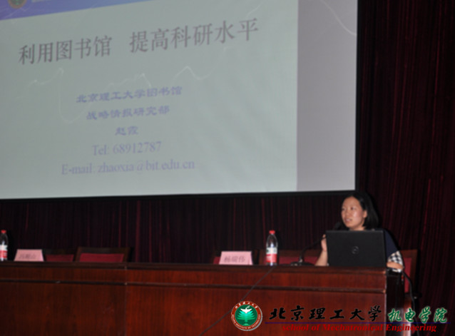 随后,机电学院邀请到学校图书馆战略情报研究部及机电学院学科馆员赵霞老师为同学们作了“利用图书馆,提高科研水平”的报告。赵霞老师首先向同学们介绍了学校图书馆概况,然后又为同学们介绍了图书馆资源,以及如何利用图书馆资源查询自己需要的科研资料。这些讲解为同学们今后的文献查询、科研写作的能力提高提供了帮助。