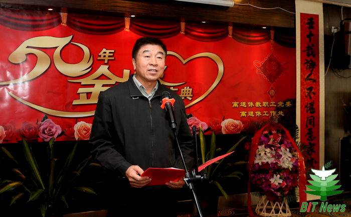 校党委书记郭大成致贺词,代表学校党委向全体金婚伉俪表示崇高的敬意和衷心的祝贺!郭书记高度赞扬了金婚伉俪们对美好生活的不懈追求和对甜蜜爱情的矢志不渝,引领了家庭和睦、代际和顺、社会和谐的良好风尚。他指出老一辈北理工人怀着对党的教育事业的无限忠诚,辛勤付出,为学校又好又快的发展奠定了坚实的基础。在新时期,老同志们仍满怀对学校炙热的情感,在BB贝博开展群众路线教育实践活动中,积极为学校发展建设建言献策,奏响了老同志“共筑中国梦”的响亮号角,以老骥伏枥志在千里的豪情老有所为,绽放出夕阳红的壮丽光辉。在老同志们的支持、理解和帮助下,全校师生共同努力,必将迎来BB贝博艾弗森官方网站新的辉煌!