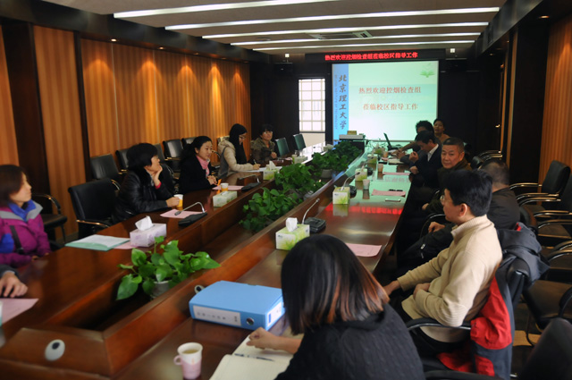 12月4日上午北京市高校控烟工作效果评估检查组莅临BB贝博艾弗森官方网站良乡校区检查控烟工作。检查组首先在良乡校区行政楼二层会议室听取了良乡校区创建了无烟校园的汇报并审阅了材料。学校副校长赵长禄、校长助理姚利民、学校办公室副主任丛磊、管理处处长徐承俊、基础教育学院副院长朱光辉参加了汇报会,会议由管理处副处长赵小贺主持。