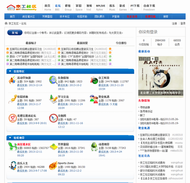 京工社区全称“BB贝博艾弗森官方网站网络社区”,创立于2010年8月,是以“互动你我,和谐共享”为宗旨的致力于服务BB贝博师生的综合性网络社区。京工社区集信息平台、交流平台、学习平台、娱乐平台四大平台功能特点于一身,信息平台为同学提供校园学习生活相关各方面信息,交流平台提供网络论坛、网上个人空间、群组等网上交流互动功能,学习平台为同学提供分享各钟专业学习资料以及相关学习经验的网络版块,娱乐平台提供电视节目在线观看、电影音乐等资源的在线播放及下载等功能。为完善各项功能给同学提供最好的网络服务,京工社区还着力打造了受到同学们广泛欢迎的“NPlive”网络电视、“找乐网”、“视听在线”等品牌版块。