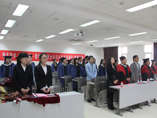 2014年3月24日,数学与统计学院在研究生楼104隆重举行2014届春季研究生毕业典礼暨学位授予仪式。数学与统计学院党委书记高伟涛、副院长史福贵、副书记副院长衡靖、概率统计系主任杨国孝,部分学生家长及全体2014届春季毕业研究生出席此次典礼,典礼仪式由研究生辅导员高冰老师主持。