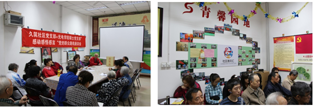 9月19日,两支部开展了“献礼重阳,看望社区老党员” 联欢会。社区老党员和年青的学生党员欢聚一堂,载歌载舞,其乐融融,合唱歌曲《相亲相爱一家人》,赞美美好生活,讴歌美好时代;学生党员为爷爷奶奶们献上亲手编制的“同心结”和亲手种植的花卉,表达了对老党员们的崇敬、爱戴与祝福之情和接力奋斗的决心。