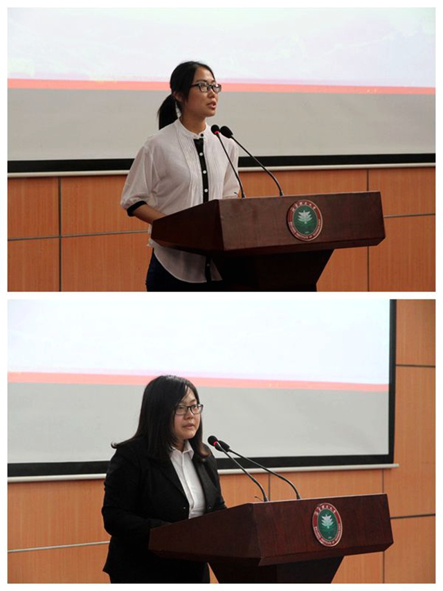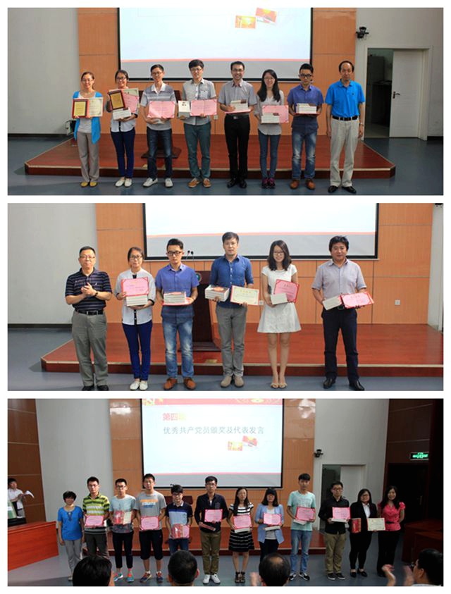 理材学部第一学生党支部书记杜妮老师代表获奖先进支部发言。她从党性修养、党员意识及发挥先锋作用等方面介绍了所在学生支部的建设情况及积累的经验,表示要牢记“全心全意为人民服务”的誓言,为早日实现“中国梦”不懈努力。信息一部2013级本科生韩晓鑫代表优秀党员发言,她感谢党组织的信任和培养,表示要甘于奉献、争当模范,努力将帮助他人成为一种常态,让服务他人作为一种信仰,时刻保持谦逊乐观的态度,坚持以优秀党员的标准严格要求自己。