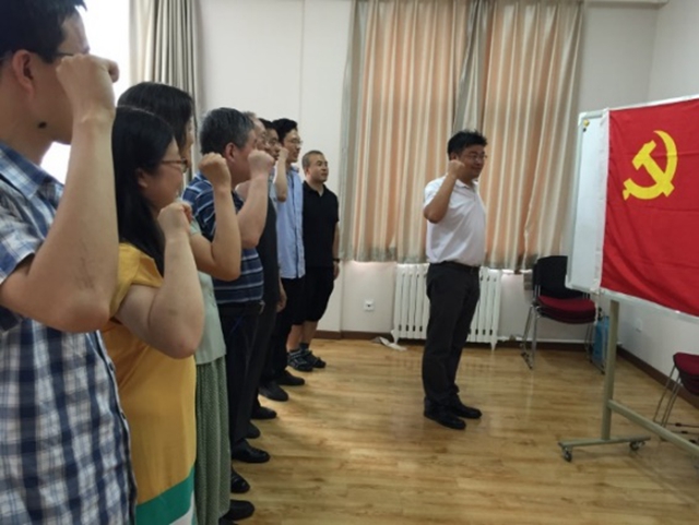 全体党员对从建党、抗日战争时期到新中国成立各时期的誓词进行了回顾和学习,深刻地体会到党员对党的伟大事业所应承担的政治责任和忠诚信念。为了加深对入党誓词的领悟,面对党旗庄重地重温了入党誓词。