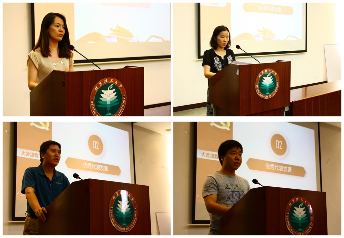 在雄壮的国歌声中,表彰大会拉开序幕。方蕾首先代表宇航学院党委,向全院党员致以节日的问候,向受表彰的先进集体和优秀个人表示祝贺,并向新加入党组织的党员们表示热烈欢迎。随后,机关党员徐莹莹、教工党员郭百巍、学生党员张宏业分别代表优秀党员讲话,三名党员代表以不同的视角与同志们分享了自己如何在平凡的岗位上发挥党员先进性。徐莹莹老师讲述了在学生工作中加强党性修养的重要意义;郭百巍老师介绍了共产党的信念在教学科研中发挥的重大影响;张宏业同学则结合实际分享了支部生活的组织经验,代表们朴实而真挚的发言获得了现场的阵阵掌声。