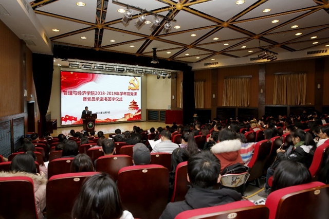 12月9日,管理与经济学院在七号楼报告厅举行专题党课暨党员承诺书签字仪式。学院党委书记王兆华及2018级全体研究生学生党员、预备党员、入党积极分子230余人参加了此次活动。