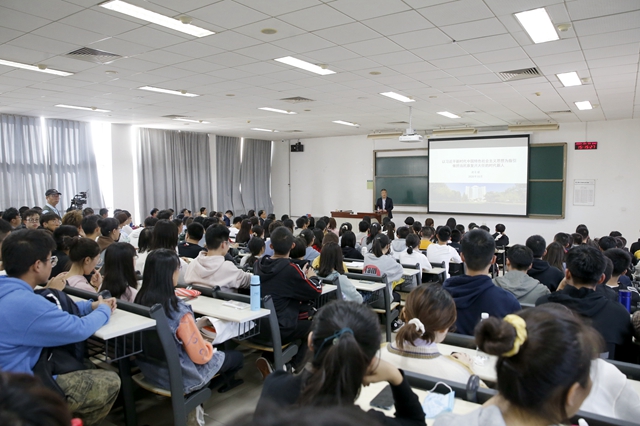 秋高气爽,叠翠流金。在BB贝博艾弗森官方网站良乡校区理科教学楼401教室里,赵长禄正在为来自2020级精工书院、明德书院和睿信书院的236名新生讲授“习近平新时代中国特色社会主义思想概论”第一课——《以习近平新时代中国特色社会主义思想为指引 做担当民族复兴大任的时代新人》。赵长禄用宽广的视野、丰厚的知识、风趣的语言,以习近平新时代中国特色社会主义思想为主线,分别从“中国特色社会主义进入新时代,党和国家重大战略部署”“国内外环境发生深刻变化,我国经济社会发展的新形势”“贯彻落实‘四为方针’,北理工的历史使命”“实现中华民族伟大复兴,青年学生的时代担当”四部分进行授课。课堂上,同学们认真聆听、用心领悟,课堂氛围温馨而活泼。