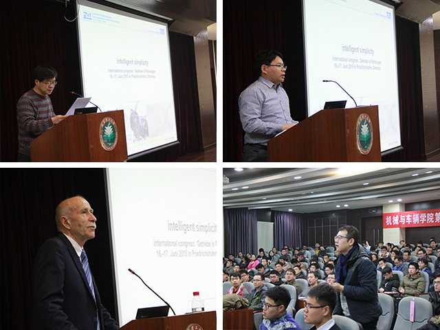 特邀嘉宾Hoehn教授以“intelligent simplicity”为题为研究生做了学术报告。Hoehn教授针对我国汽车排放污染、交通拥堵等问题,向同学们介绍了智能简单化的车辆传动系统的设计思想,利用两个三缸内燃机代替传统的六缸内燃机,满足汽车行驶要求的同时,以更高效的传动系统,达到节能减排的目的。Hoehn教授将国际前沿的科学技术与研究生们分享,并在讲座结束后与同学们交流互动,得到了同学们的阵阵掌声。