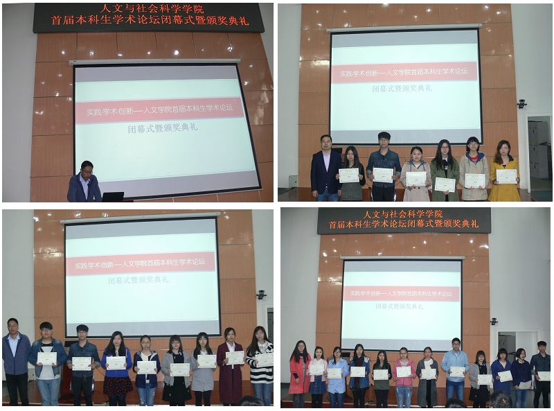 4月12日下午,人文学院“实践•学术•创新——首届本科生学术论坛”闭幕式暨颁奖典礼于良乡综合教学楼报告厅成功举办。人文学院副院长贾利军教授、副书记副院长徐贵宝老师、团委书记孙硕老师出席闭幕式。闭幕式由人文学院辅导员于满老师主持。闭幕式现场公布获奖结果,并为获奖代表颁发证书及奖励。