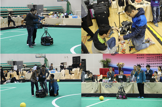 。。在本次大赛中,机器人中型组项目是一个传统国际合作项目,以MAS(Multi-Agent System)和DAI(Distributed Artificial Intelligence)为主要研究背景,该项目的最终目标是:到2050年,开发完全自主仿人机器人队,赢得人类足球世界冠军队。在本次大赛中,BB贝博艾弗森官方网站ROBIT代表队参加了科学挑战赛和技术挑战赛。科学挑战赛是一项学术交流性质很强的竞赛,其设立的目的便是为了给参赛队伍一个交流分享科研技术的平台,大家通过展示对于当前存在问题的解决方案和未来发展方向的研究,从而起到推动机器人科学发展的作用。软件科技创新创业基地机器人足球队加入中型组已经有六年的历史,在技术上一直不断探索,精益求精。在科学挑战赛中,ROBIT展示了他们在守门员系统方面的研究。在传统的全景视觉守门员中,存在对球的定位不够以及无法防守高空球等问题的解决。为了解决这些问题,球队增加了kinect深度摄像头来获得场地的深度信息,通过深度信息辅助判断从而准确预测球的运动路径,进行更好的防守策略,并且增加了可升降杆,从而实现对高空球的防守。最终,ROBIT在此项目上名列季军。