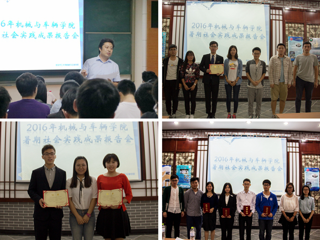2016年9月20日、21日,机械与车辆学院2016年暑期社会实践成果报告会分别在车辆实验楼报告厅(中关村校区)、理学楼B206(良乡校区)顺利举行。此次报告会围绕青年服务国家及学校“青年服务国家—投身助力十三五,青春奋进中国梦”主题展开,学院党委副书记副院长范文辉,团委书记郝佳馨,团委副书记李超,2014级本科生辅导员程继超,2015级本科生辅导员马凯,2016级辅导员张兆鹏,学生生涯发展服务中心主任张雨甜、副主任周雪,专职辅导员武颖,往届优秀社会实践团长彭浩然及部分2016级本科新生参加了报告会。