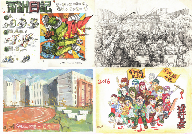 此次展览,由徐贵宝老师与孙飞老师共同为此次展览揭幕,经过遴选的最佳作品随即展现。2016级高楚同学作为学生代表发言,她回顾了刚刚结束的军训时光,军训生活历历在目,教官送别感人泪下;同时,她也展望了大学的新生活,希望同学们能在将来的学习生活中充分发挥专业特长,为学校文化建设贡献力量。学院将此次“画说军训”主题优秀作品赠予学校武装部,吕晶老师代表学校武装部接受赠予。
