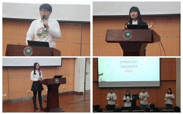 第十届“天桥大学生主任助理实践团”团员用幽默风趣的三句半《大话天桥》展现出天桥街道丰富多彩的民俗文化与社会实践经历;实践团团长肖剑桥进行团队成果汇报和展示。2016年优秀暑期社会实践团团员代表王卉与刘敏通过分享自身暑期社会实践经验,为同学们详细讲解了社会实践的具体过程与技巧方法。王悦同学以一首《最初的梦想》表达出同学参与实践、躬行求真的信念。