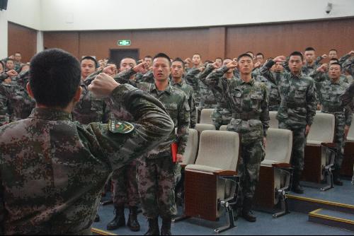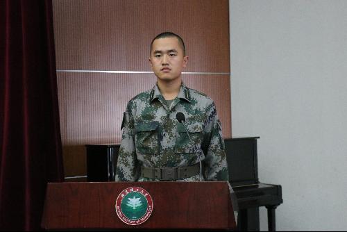 2016级新生张学顶代表全体国防生发言,他承诺坚定理想信念、打牢专业基础、锻炼过硬作风,用坚实的肩膀扛起富国强军的重任。全体国防生满怀携笔从戎的决心,在16中队中队长叶云的带领下庄严宣誓,志愿成为光荣的中国国防生。