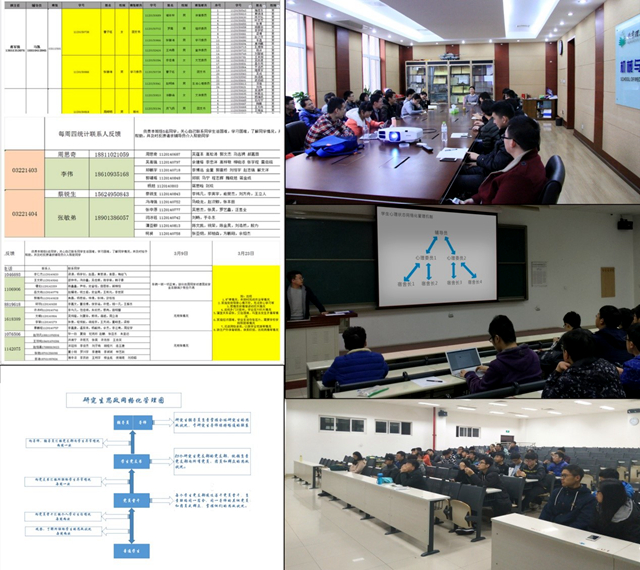 3月初,机械学院学生工作组制定了实行学生网格化管理的相关制度和文件,并报学院党政联席会讨论通过。随后学院组织召开了学生工作组会议,会上布置了如何推进学生网格化管理的尝试办法,并针对网格化管理体系,反馈机制进行讨论,落实学生网格化管理相关实施细则,明确学生建立网格化管理工作重要性。