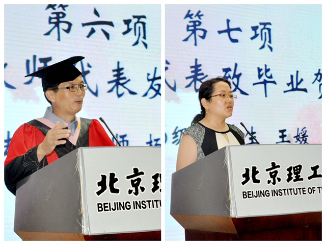 本科生考沙尔·麦尔阿木与研究生留学生皇马则作为各自毕业生代表发言。考沙尔·麦尔阿木则用四年的法学专业学习与学生活动经历怀念即将结束的大学生活;皇马则全英文地表达了作为留学生来到中国学习的荣幸、作为留学生的文化、学术交流的桥梁作用以及对北理法学院培育的感激之情。