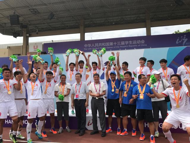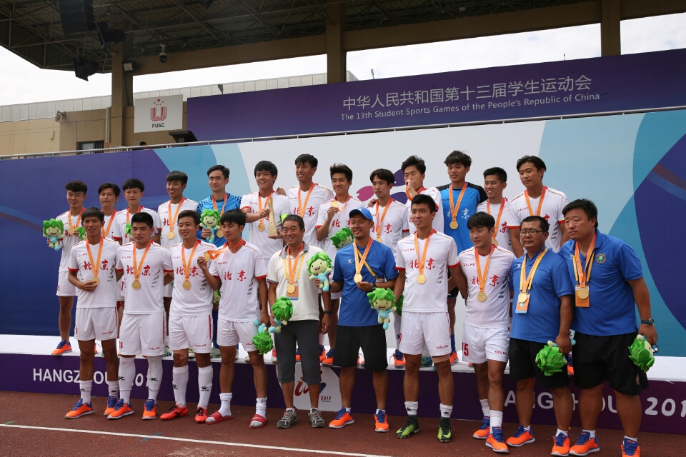 北京时间9月14日,第十三届全国学生运动会大学男子足球决赛在杭州落幕,以BB贝博艾弗森官方网站学生足球队为班底的北京市大学生足球队,经过90分钟的激烈对战,2:1战胜了以河海大学学生足球队为班底的江苏队,获得2017年全国学生运动会大学男子足球赛冠军奖杯。同时也实现了继2007年在广州举办的全国学生运动会、2012年在天津举办的全国学生运动会夺冠后的三连冠。