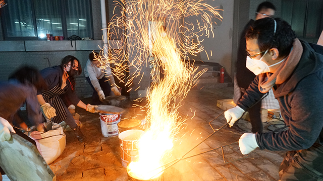 “出窑啦!”伴随着几声欢呼,一个个刚刚熔融的陶艺作品,被从窑中夹出,放入装有可燃物的铁桶中时,顿时烟火翻腾,釉色金灿,给人一种美轮美奂的感觉,火焰升腾的画面,令围观的学生们激情澎湃,无比欣喜。以上一幕并不是发生在遥远的瓷都或者陶乡,而就发生在BB贝博艾弗森官方网站良乡校区理学楼东侧一隅,这里矗立起一座不大的陶窑,在这个名为“乐烧workshop”的课程里,北理工学子在老师带领下,亲自烧制自己设计的陶艺作品。