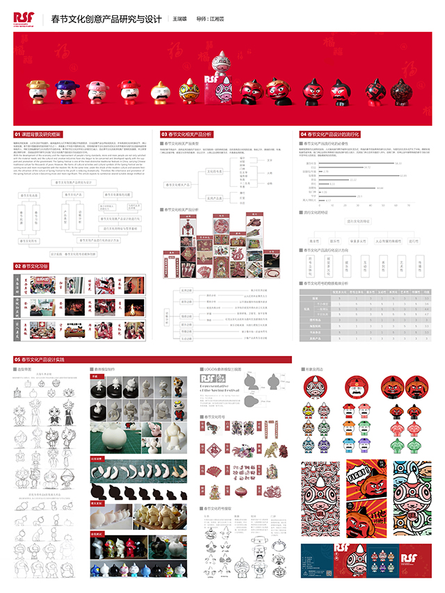 设计说明:结合流行文化的特征,从视觉多元化、符号立体化、娱乐化、互动性、系列化、艺术性以及传播性等方向出发,对传统的春节传统文化进行创意设计,以抽象的年兽平台玩具为载体,将春节文化符号予以表现,希望达到继承和传播中国传统文化的效果。