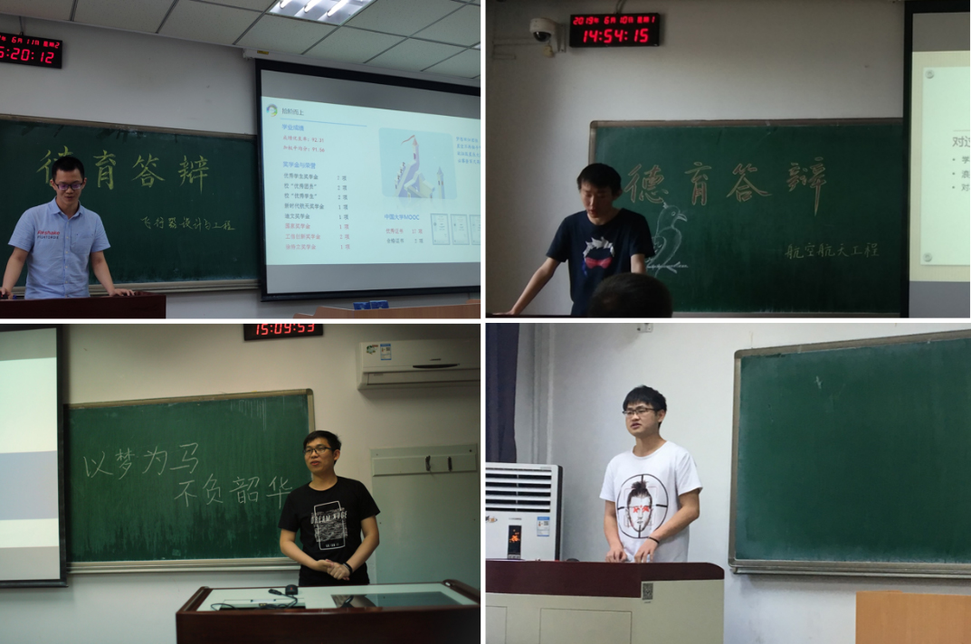 宇航学院2015级本科生德育答辩围绕“我的祖国我奋斗”主题教育活动展开,各班结合班级特色,分别以“青春无畏,逐梦扬威”“追求卓越,志在蓝天”“青春之名,梦想前行”“大学 青春 理想”等作为答辩交流会的主题。在德育答辩的过程中,同学们不仅对过去进行了总结和反思,而且对未来进行了规划和展望,分享了各自的青春理想,坚定了航天报国的决心。参与德育答辩的老师对同学们的答辩进行了指导与点评,对同学们四年大学生活中取得的成绩给予了肯定,同时祝愿同学们前程似锦。勉励同学们一定要牢记习近平总书记对青年学生的嘱托,树立“四个正确认识”,将报效祖国理想和个人价值追求统一起来,将理想信念践行在服务国家建设的使命担当之中,成为德智体美劳全面发展的社会主义建设者和接班人。