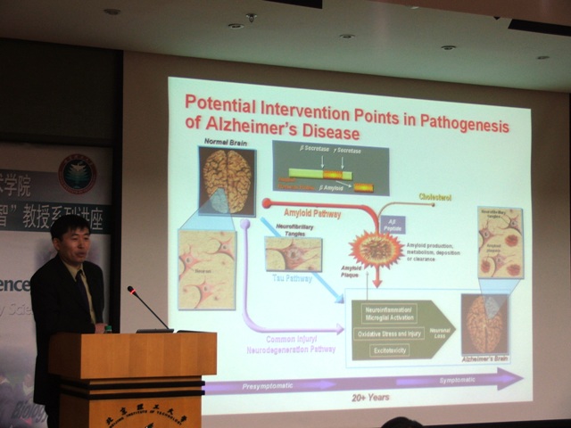 在讲座中,李新民教授介绍了目前在抗老年痴呆这个领域上的总体情况及其目前的研究动态。他指出抗老年痴呆是一个对人类健康与发展具有重要的一个方面,在讲座中他重点讲述了老年痴呆症的病理、其在各国的发病情况、目前的治疗手段以及今后的治疗药物的研发方向和策略。现阶段随着医疗手段的发展和进步,对治疗人类的各种病症都起到了积极的作用,但是老年痴呆症人们还没有完成的攻克,李教授分析了这其中的各个环节,并提出了自己独到的见解和一些战略问题。