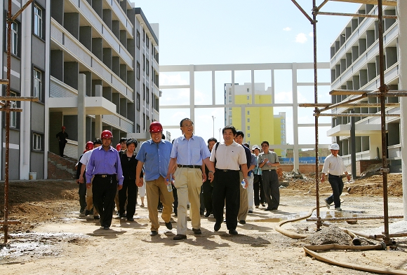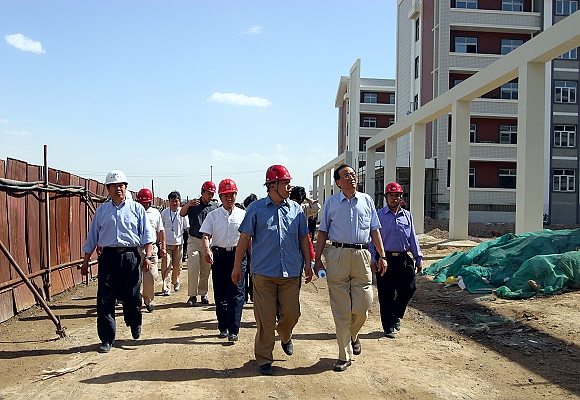 听取汇报后匡校长不顾沙尘暴恶劣天气影响,依然顶着8级大风带领大家认真的视察了各个工地,及时提出了存在问题。