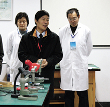 专家罗正祥、袁军堂、高占先在物理实验中心测试学生物理实验技能