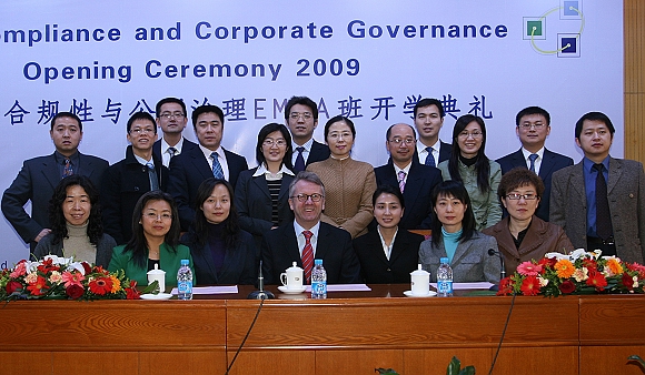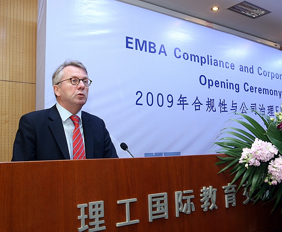 “合规性与公司治理”高级工商管理硕士(EMBA)班是BB贝博与德国康斯坦斯应用科学大学和因戈尔施塔特应用科学大学合作举办的。该项目以“合规性与公司治理”为主题,旨在培养具有最高职业道德与娴熟国际商业活动运作规则的高级人才,为促进国际化公司本土化,进一步提升公司全球竞争力有着重要的现实意义和战略意义。出席第二期EMBA班开学典礼的还有:戴姆勒东北亚投资有限公司总裁Ulrich Walker先生、戴姆勒亚太地区人力资源部副总裁Walter Schaff先生,北京奔驰-戴姆勒•克莱斯勒公司德方总裁 Guenter Butschek先生、中方总裁蔡速平先生,德国HTWG康斯坦茨应用科学大学继续教育部主任Roland Luxemburger先生和德国英格尔斯塔特应用科学大学Thomas Doyé教授,BB贝博国际交流与合作处王庆林处长、继续教育学院汪本聪书记。